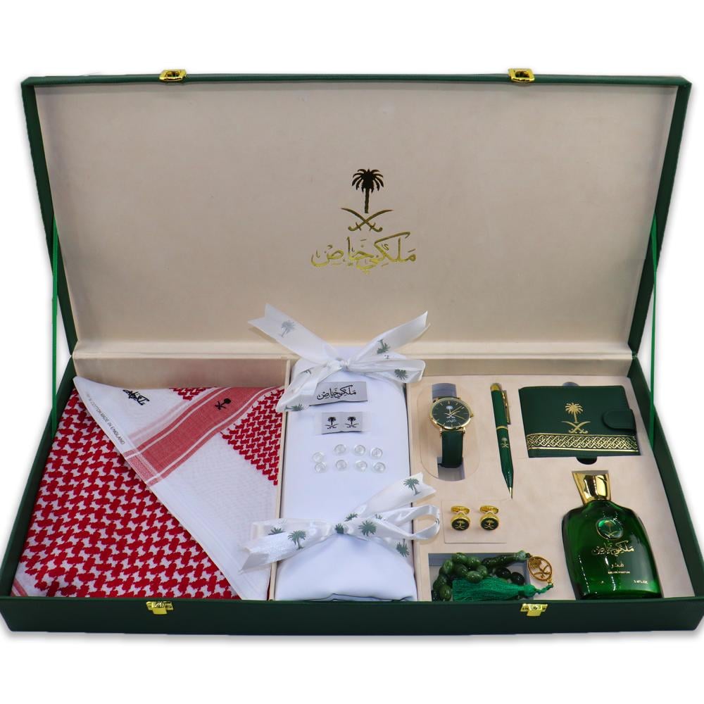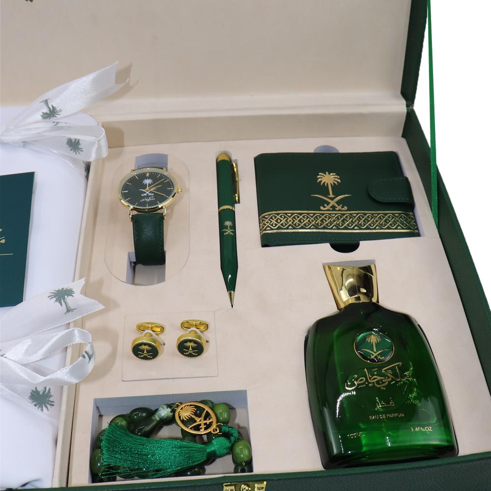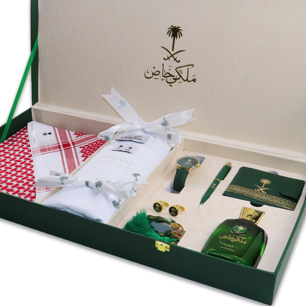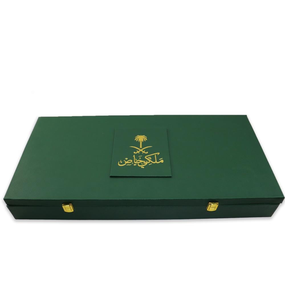 - ✅ تغليف فاخر بلون أخضر ملكي مع شعار المملكة وسيفين ونخلة.