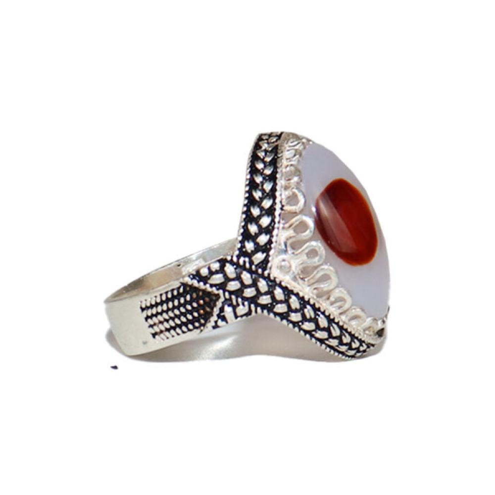 • في وسطه قطعة من العقيق اليماني الفاخر المصقول بشكل رائع و بتداخلات الوانها تعطي مزيج مختلف يزيد من جمال الخاتم .