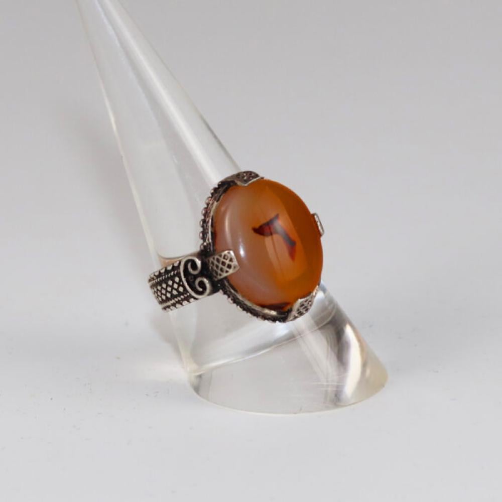 • خاتم عقيق يماني ذو تصميم جذاب يأتي بهيكل خارجي من الفضة يحوي في طياته تفاصيل متقنة الصنع وفراغات غائرة تعطيه مظهرا غاية في الجاذبية .