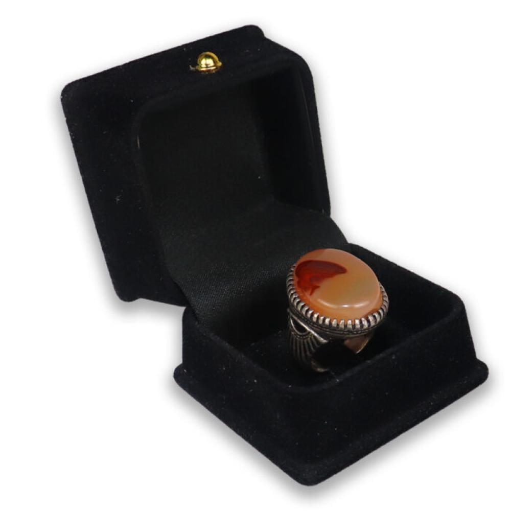 • في وسطه قطعة من العقيق اليماني الفاخر المصقول بشكل رائع و بتداخلات الوانها تعطي مزيج مختلف يزيد من جمال الخاتم .