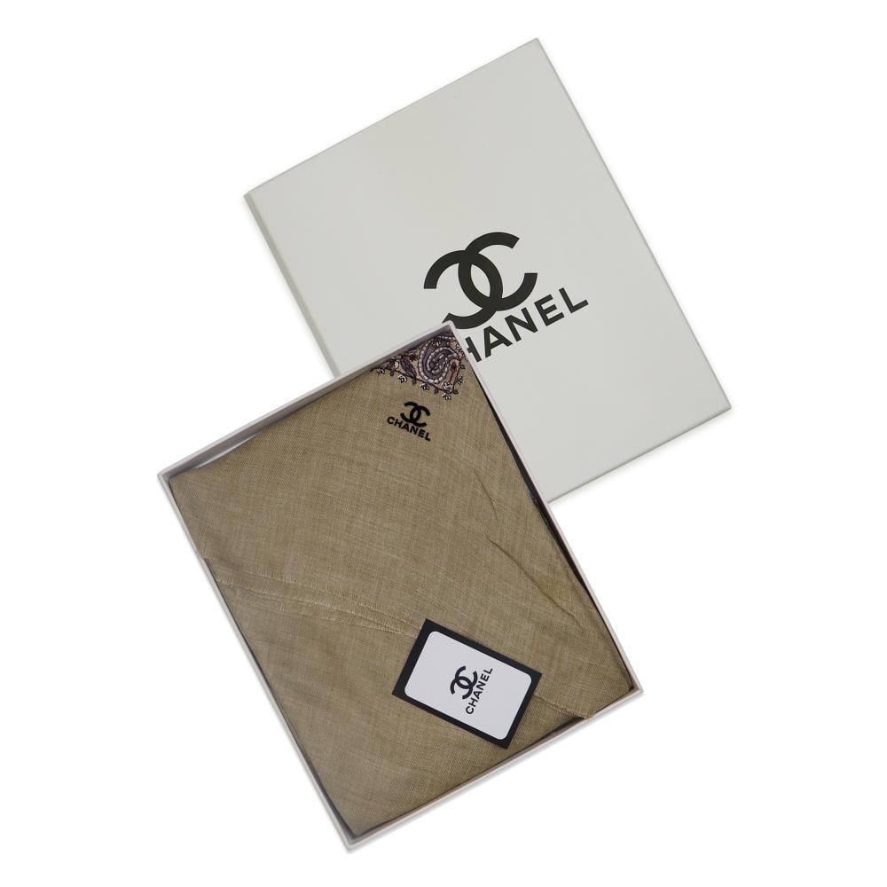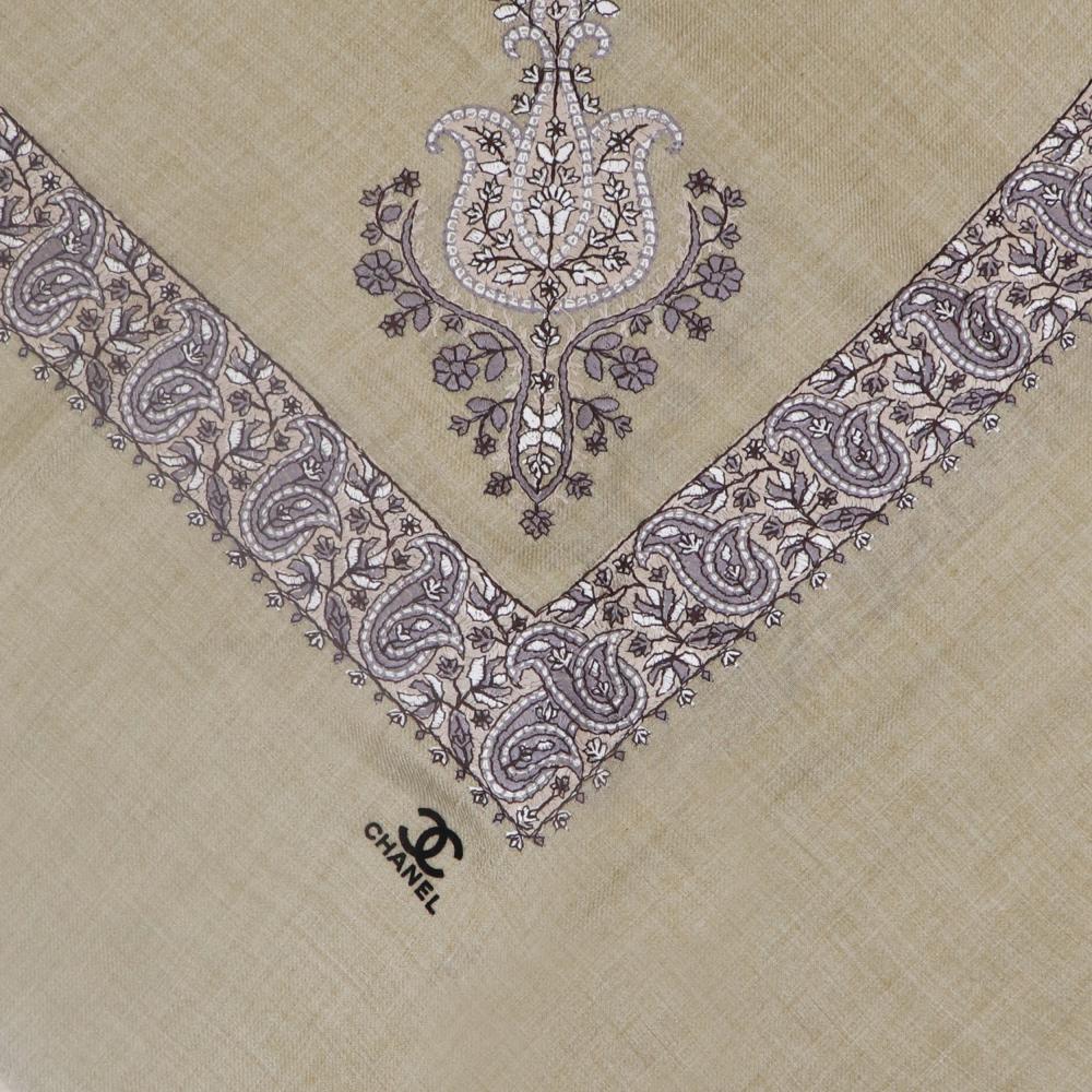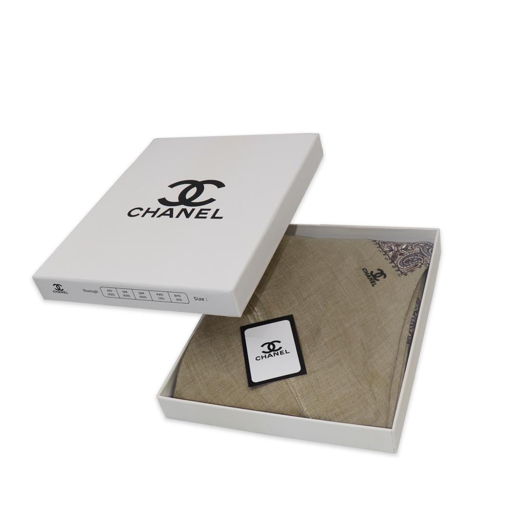 - الشال يحمل شعار Chanel مطرزًا بدقة عالية ليبرز هوية العلامة الفاخرة.