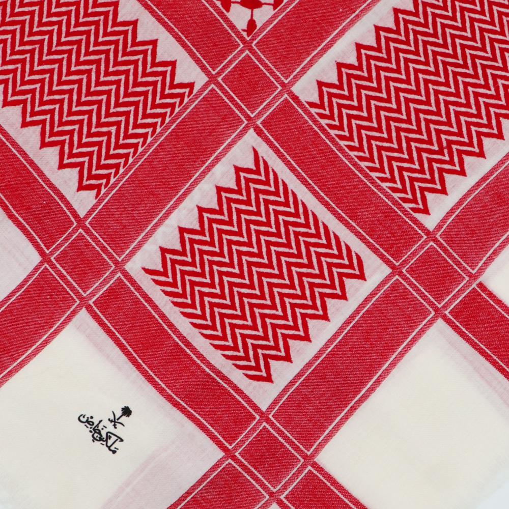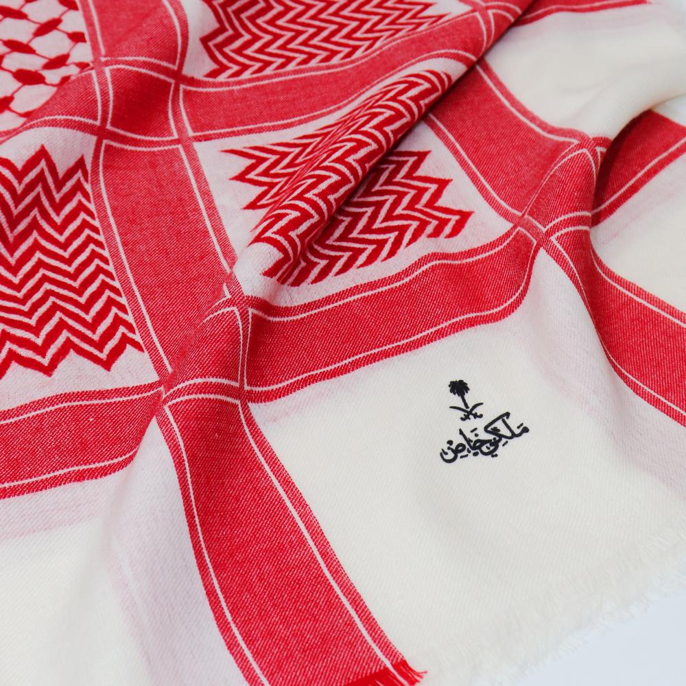- اللون الأساسي: أبيض مع نقوش حمراء تقليدية بتصميم شماغ عربي أصيل.