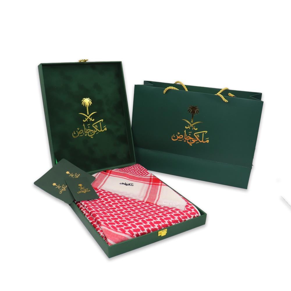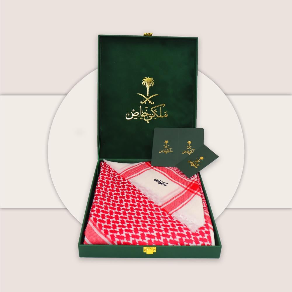 - الصندوق: علبة فاخرة بلون أخضر ملكي، مزينة بشعار النخلة والسيفين باللون الذهبي.